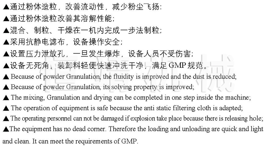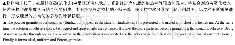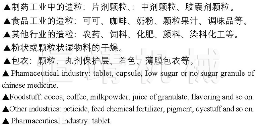 制药工业中的造粒:片剂颗粒、中剂颗粒、胶囊剂颗粒 视频工业的造粒:可可、咖啡、奶粉、颗粒果汁、调味品等 其他行业的造粒:农药、饲料、化肥、颜料、燃料化工等