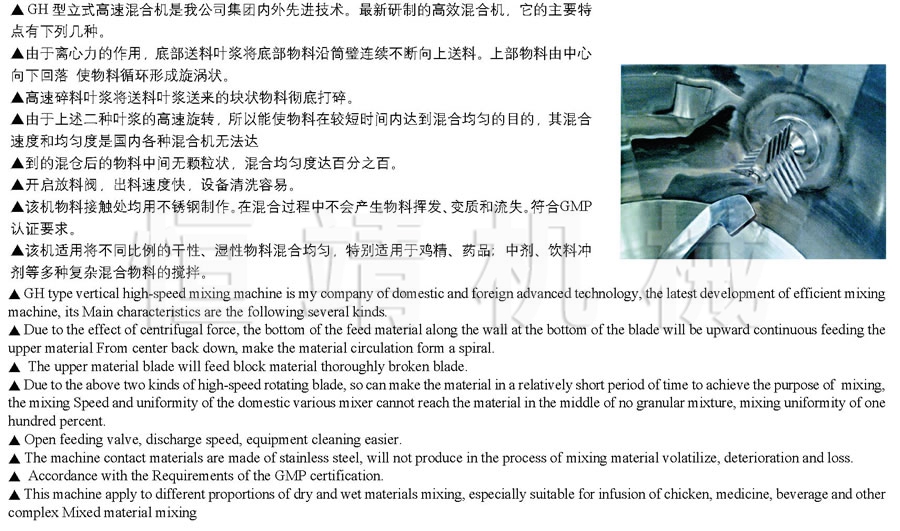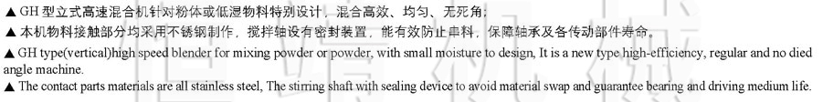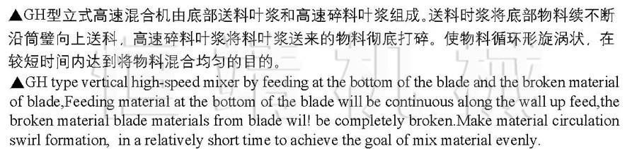 GH型立式高速混合机由底部送料叶浆和高速碎料叶浆组成。送料时浆将底部物料续不断沿筒璧向上送料,高速碎料叶浆将料叶浆送来的物料彻底打碎。使物料循环形旋涡状,在较短时间内达到将物料混合均匀的目的。