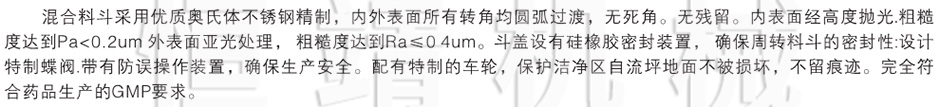 混合机斗在固体制剂生产流程中既是混合容器又是周转容器,物料可在同一容器中完成不同的用途,达到物料不转料、不加料等频繁的工序,有效地防止粉止与交叉污染。