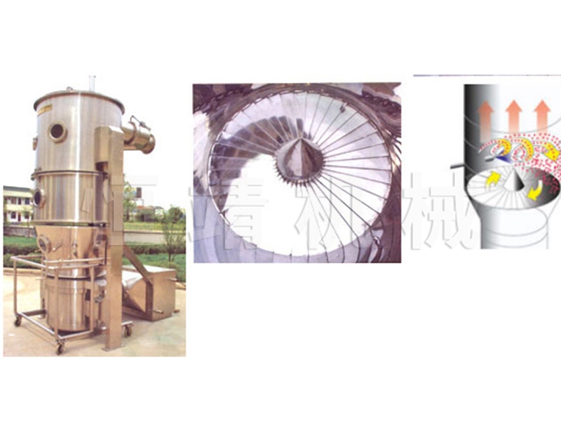 旋流流化床制粒包衣机是将流化床做成叶片式结构的流化床,并使叶片呈一定斜度,让气流从叶片的间隙通过,形成环流状的强大气流,使物料呈旋涡状似的有序运动,同时安装在侧壁的气动喷嘴将粘合剂或包衣液喷入呈旋涡状的物料层,从而将粉体制成颗粒或获得连续均匀的衣膜。