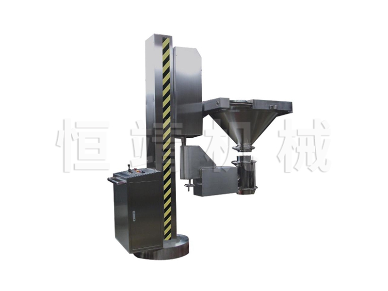 工作时,将锥形料斗与一步制粒机(或干燥机)的物料床(锅)扣合,锁紧锥斗,使两者扣成一体,启动提升按钮,料仓提升;启动翻转按钮,料仓可翻转180度。打开解锁按钮,水平旋转立柱到工艺要求位置,再下降料仓到工作高度,开启整粒机,打开蝶阀,使物料经过整粒后密闭转移到下一工序。