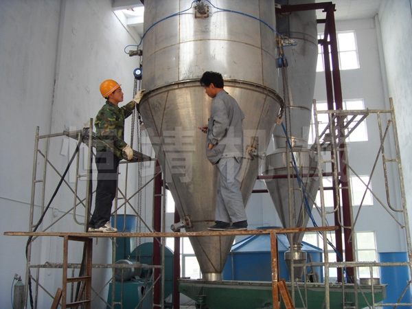 空气经空气过滤器后进入空气加热器,当空气加热器到给定的温度后以切线方向进入热风分配器,经热风分配器作用后的空气,均匀地、螺旋式地进入干燥室,同时料液由雾化器雾化为20~60um的雾滴,当雾滴与热空气接触后就迅速汽化干燥为粉末或颗粒产品。采用旋风风离器直接收集后经气力输送至效料仓,完成物料的冷却及输送,废气由风机排出口经水沫除尘器排出。