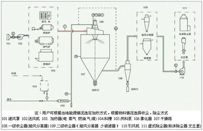 喷雾干燥机为开式循环,并流式,离心式雾化。干燥介质空气经过初、中效空气过滤器过滤后根据操作指令由鼓风机吸取再经加热器加热通过过滤器的热风分配器进入喷雾干燥主塔。液体物料根据操作指令经过蠕动泵,进入高速旋转的离心喷头,在离心力作用下被分散成小雾滴。在喷雾干燥主塔内,小雾滴与热风在充分接触,沿其特定路径进行热交换后被干燥成为产品,然后通过旋风分离器实现分离,固体物料被收集,气体介质再经过过滤后被排出。整套喷雾系统易清洁、无死角,符合GMP要求。