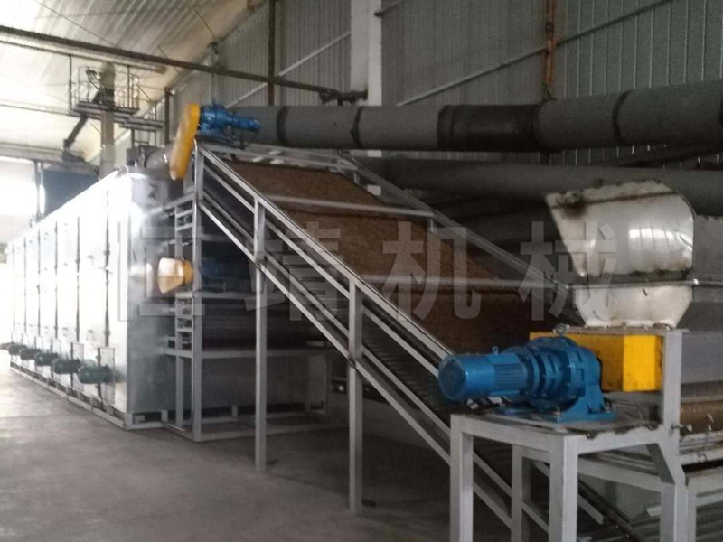 干燥机工作时,冷空气通过热交换器进行加热,采用科学合理循环方式,使热空气穿流通过床面上的被干燥物料进行均匀的热质交换,机体各单元内热气流在循环风机的作用下进行热风循环,后排出低温高湿度的空气,平稳地完成整个干燥过程。